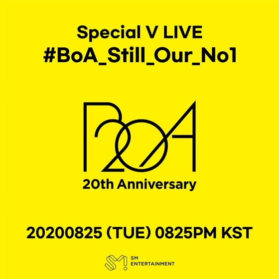 18일 소속사 SM엔터테인먼트에 따르면 보아는 데뷔 기념일인 25일 오후 8시 25분부터 네이버 V 라이브 SMTOWN 채널을 통해 생방송 'BoA Still Our No.1 – BoA Debut 20th Anniversary Special V LIVE'(보아 스틸 아워 넘버원 – 보아 데뷔 20주년 기념 스페셜 브이 라이브)를 진행한다.