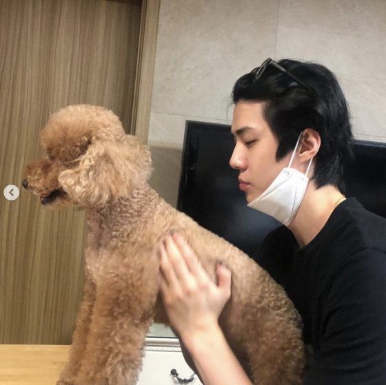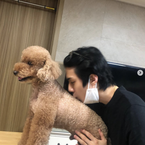 그룹 엑소 멤버 세훈이 반려견 무슈에 입을 맞추며 달달한 분위기를 연출했다.
