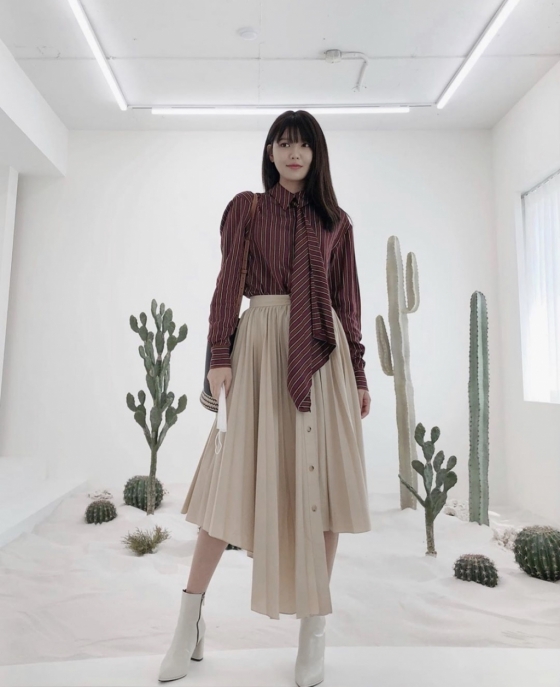 사진 속 수영은 가을 분위기의 옷을 입고 있다. 베이지 계열의 옷에서 따뜻한 분위기가 묻어 나온다. 수영은 긴 팔다리와 작은 얼굴로 모델못지 않은 비율을 뽐냈다.