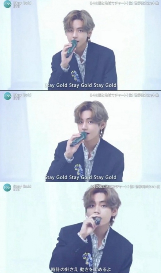 방탄소년단은 먼저 선을 보인 '스테이 골드'에서 푸른빛이 도는 무대를 배경으로 멤버들은 의자에 앉아서 불렀다. 뷔는 단정한 검은색 슈트 차림으로 등장해 곡에 맞는 차분한 분위기로 더욱더 깊어진 보컬을 선보였다.