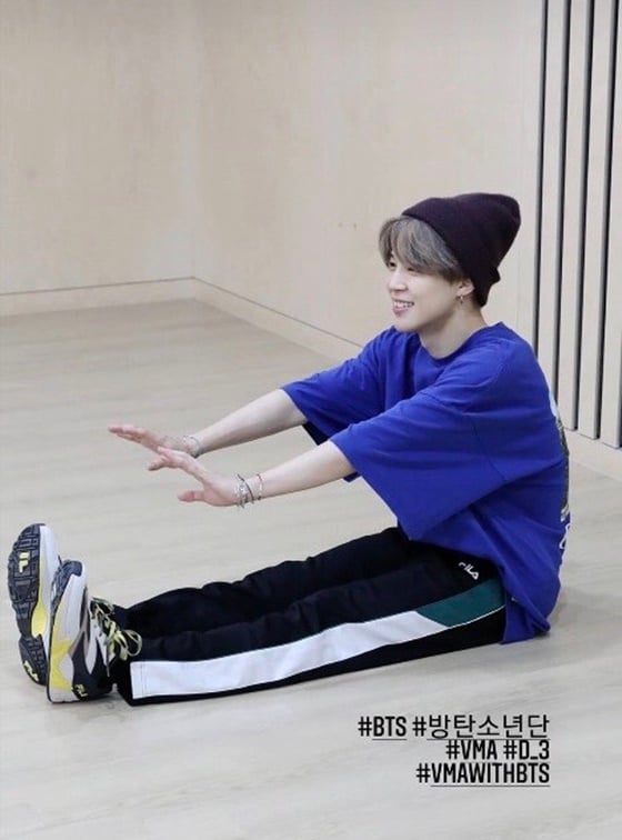 '#BTS #방탄소년단 #VMA #VMAWITHBTS'의 해시태그와 함께 공개된 사진 속 지민은 안무 연습실 바닥에 앉아 유연한 몸으로 다리를 쭉 펴고 손을 들어 올려 스트레칭을 하며 환한 웃음으로 시선을 사로잡았다.