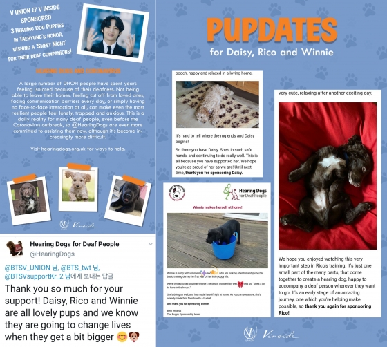 뷔유니언과 한국 팬베이스 뷔인사이드는 지난 6월 뷔의 자작곡 'Sweet Night'의 발매 100일을 축하하며 영국 청각견협회(Hearing Dogs for Deaf People)를 통해 데이지, 리코, 위니를 후원했다.