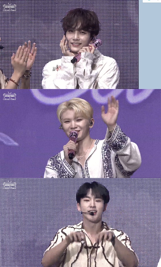 이날 'My My'(마이마이)로 팬미팅의 포문을 연 세븐틴은 한국어를 비롯해, 영어, 중국어 등 다양한 언어로 전 세계 팬들에게 인사했다.