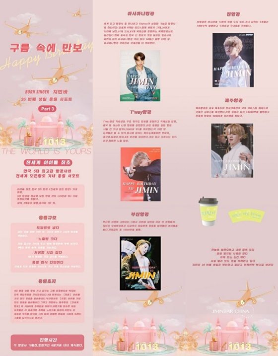 방탄소년단(BTS) 지민의 생일(10월 13일)을 맞아 중국 팬들이 국내 5개 항공사 전 세계 모든 노선에 기내 잡지 광고를 통해 축하한다.