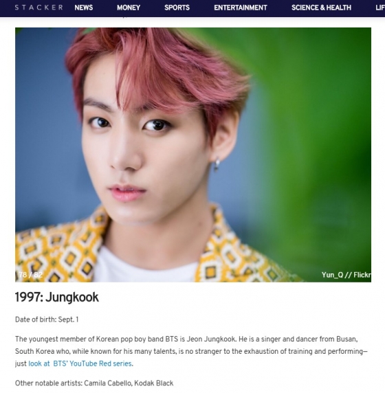 정국은 1997년에 태어난 가장 유명한 뮤지션에 이름을 당당히 올렸다. 스태커는 "방탄소년단 막내는 전정국"이라며 "그는 많은 재능으로 유명하지만 연습과 공연으로 탈진하는 데 익숙한 한국 부산 출신 가수이자 댄서"라고 설명했다. 스태커는 1997년생 유명 뮤지션 톱3 중 정국을 톱으로 꼽고 이어 미국 유명 가수 카밀라 카벨로(Camila Cabello)와 미국 래퍼 코닥 블랙(Kodak Black)을 '다른 유명한 아티스트'(Other notable artists)로 이름만 적시했다.