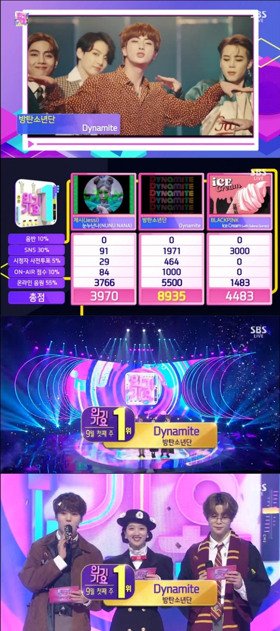 이날 '인기가요' 1위 후보에는 제시의 '눈누난나', 방탄소년단의 'Dynamite', 블랙핑크의 'Ice Cream'이 이름을 올렸다. 발표 결과 방탄소년단이 1위 트로피를 획득했다.