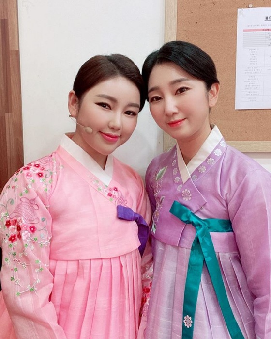 사진 속 송가인은 핑크빛 한복을 입고 동료 소리꾼들과 포즈를 취하고 있다. 단아한 매력이 눈길을 끈다.
