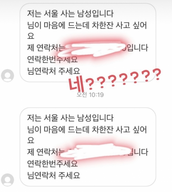사진 속에는 한 남자가 "저는 서울 사는 남성입니다. 님이 마음에 드는데 차 한 잔 사고 싶어요. 제 연락처는 *입니다. 연락 한 번 주세요. 님 연락처 주세요"라는 DM을 보낸 것이 담겨있다. DM을 보낸 남자는 나비가 답을 하지 않자 같은 내용의 메시지를 또 다시 보내며 나비의 대답을 촉구했다.