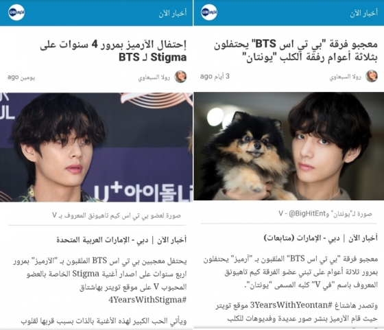 아랍권 최대 위성방송사 중 하나인 UAE 알 안(Al Aan) TV의 뉴스프로그램 아크바르 알 안(Akhabar Al Aan)은 지난 7일(현지 시간)과 9일 각각 뷔에 대한 소식을 전하며 깊은 관심을 나타냈다.