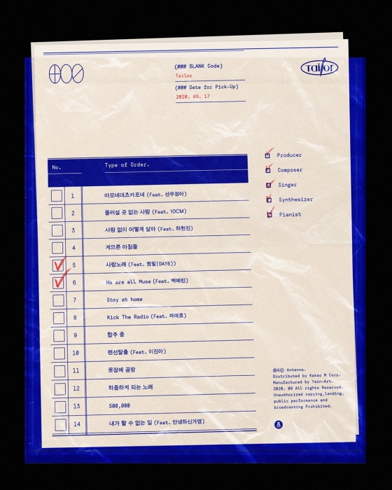 11일 소속사 안테나 측은 공식 SNS를 통해 프로듀서 더 블랭크 숍(The BLANK Shop)의 첫 번째 정규앨범 '테일러(Tailor)'의 트랙리스트를 선보이며, 화려한 컬래버레이션 라인업을 알렸다.