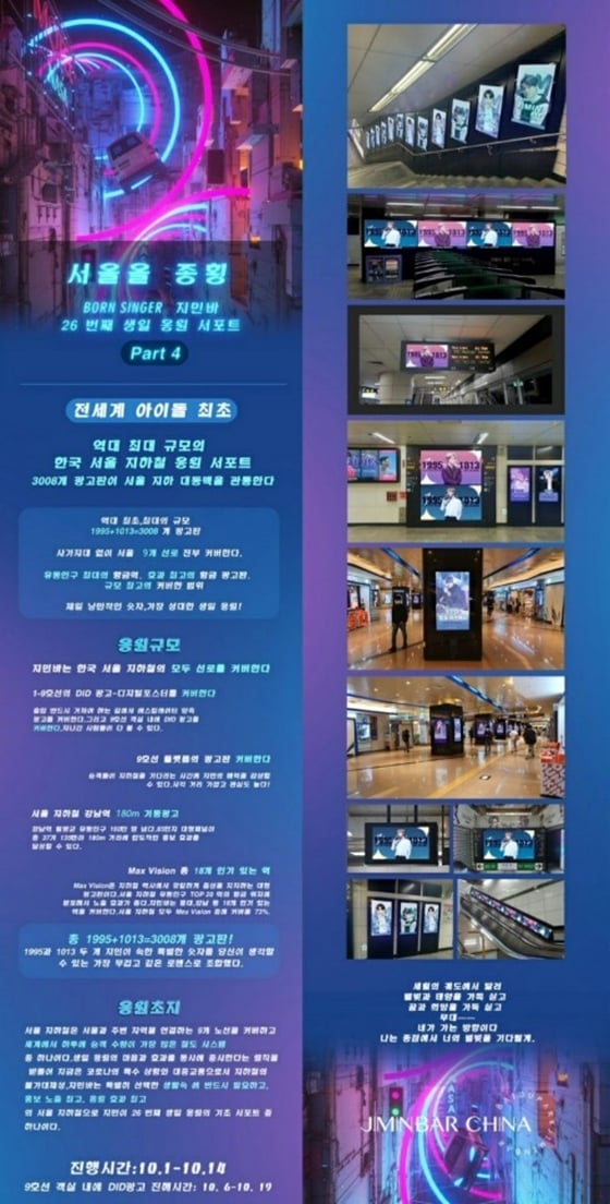 '지민 바 차이나'는 "서울 지하철 1~9호선 전체에 대형 스크린 광고를 비롯해 지민의 생일 축하 응원 광고가 시행되며, 이는 K-POP 아이돌 최초로 진행된다"고 설명했다.