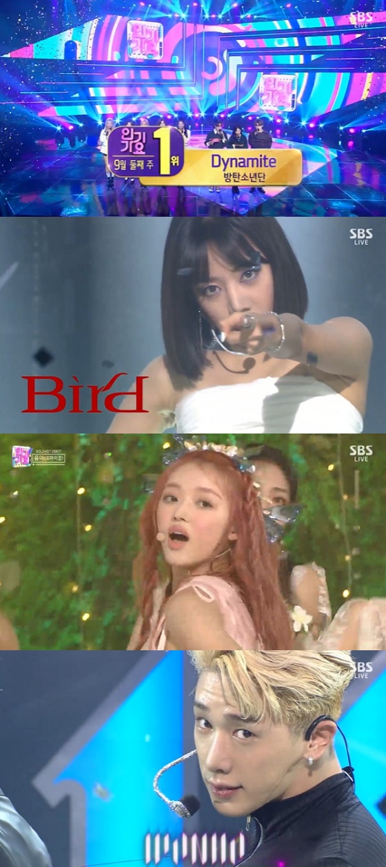 방탄소년단은 13일 오후 방송된 SBS '인기가요'에서 지난달 21일 발매한 영어 신글 '다이너마이트'(Dynamite)로 블랙핑크의 '아이스크림'(Ice Cream)과 ITZY의 '낫 샤이'(Not Shy)를 제치고 1위에 올랐다.