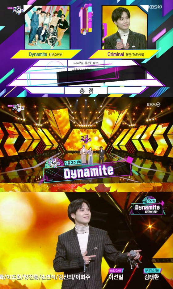 이날 BTS는 출연 없이 1위에 올랐다. 함께 1위에 올랐던 태민은 'Dynamite'에 맞춰 춤을 추며 BTS의 1위를 축하했다.
