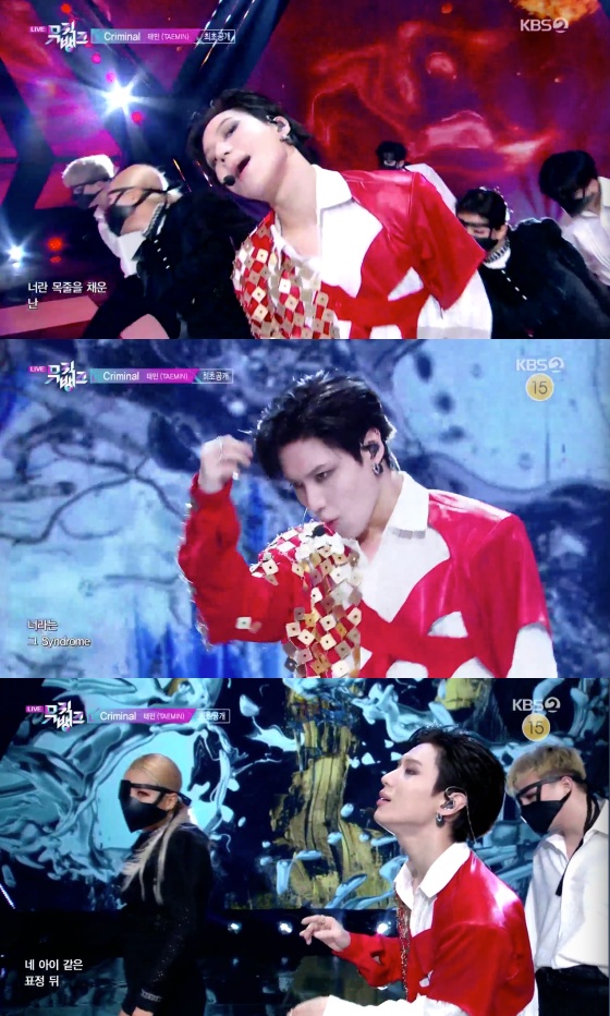 태민은 신곡 'Criminal'로 컴백했다. 태민은 강렬한 붉은빛 의상으로 몽환적인 분위기를 강조했다. 태민의 표정 연기와 현대 무용 같은 안무는 한 편의 예술극을 본 것 같은 느낌을 줬다.