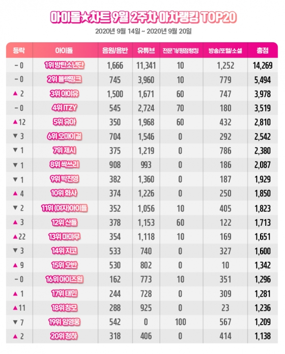 아이돌차트가 25일 발표한 9월 2주차 아차랭킹에서는 방탄소년단이 음원점수 1489점, 앨범점수 177점, 유튜브 점수 1만 1341점, 검색점수 1242점 등 총점 1만 4269점으로 1위에 올랐다. 이로써 방탄소년단은 아차랭킹 연속 1위 기록을 4주로 늘렸다.
