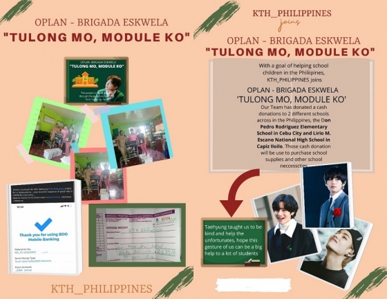 지난 22일 뷔의 필리핀 팬베이스 'KTH_PHILPPINES'는 "늘 상대방에게 친절하고 도움을 주려는 태형의 모습에 영감을 얻어 이 프로젝트를 계획했다"고 밝히며 필리핀의 돈 페드로 로드리게스 초등학교와 리리오 엠에스캄 국립 고등학교에 기부금을 전달했다. 이 기부금은 학생들이 학용품 및 필요 물품을 구입 하는 데 사용될 예정이다.
