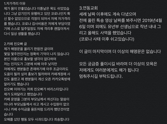 이후 아리는 "마지막으로 글을 올립니다"라는 말과 함께 장문의 해명글을 게재했다.
