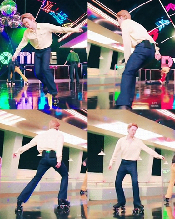 지민은 머리 위로 손뼉을 치고, 회전을 하는 등 능숙하게 롤러스케이트를 탔다.