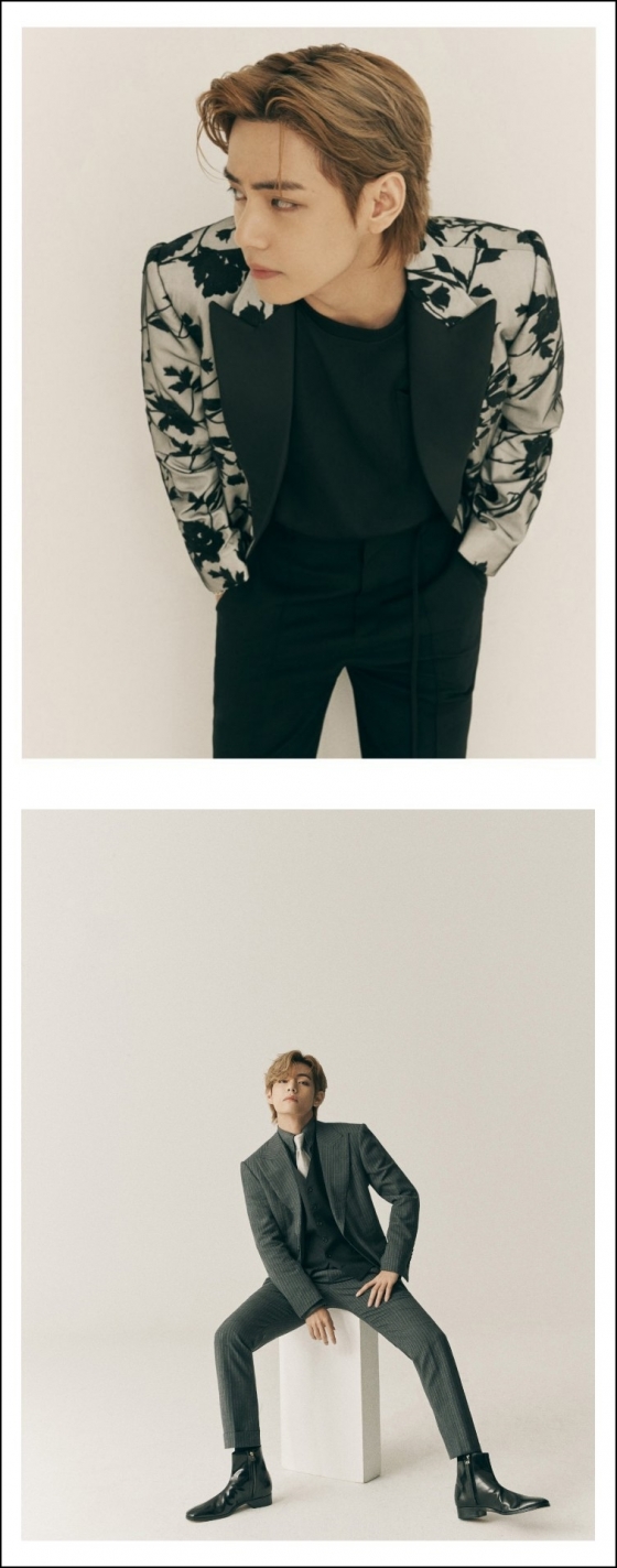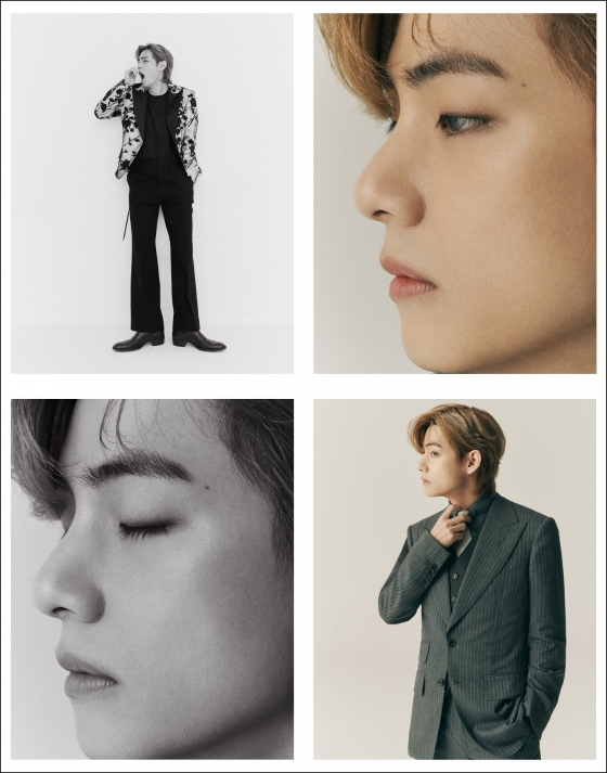 뷔는 공개된 6장의 사진에서 그레이 스트라이프 수트와 꽃무늬가 장식된 블랙 수트를 입고 다양한 표정과 포즈를 선보였다. 뷔는 조각 같은 옆태로 '국보급 미모'를 뽐냈다.