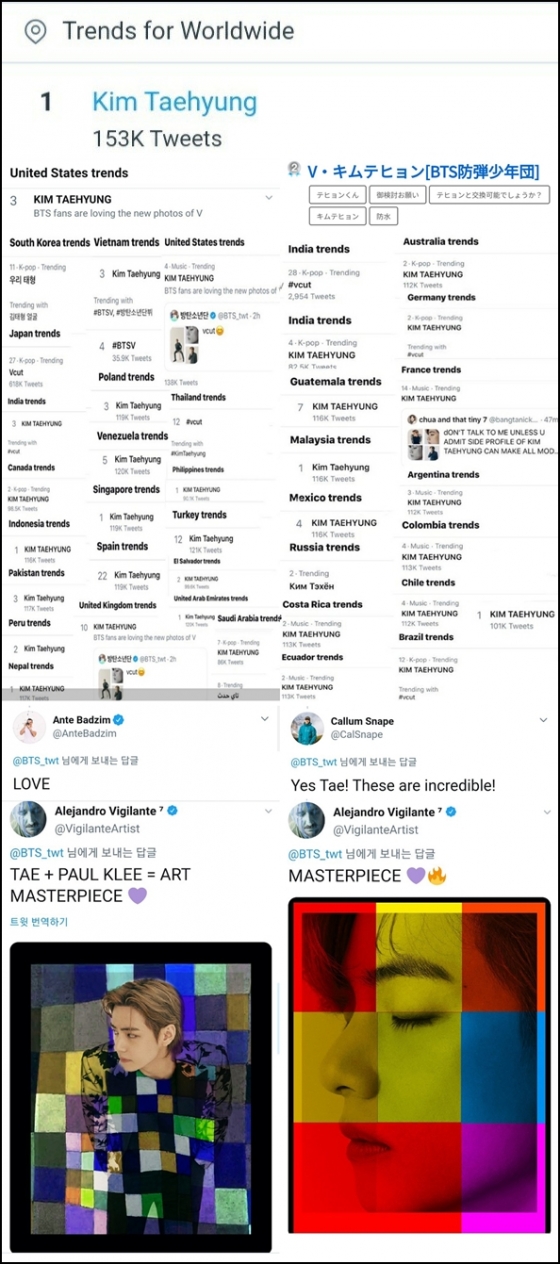 SNS상에는 뷔에 대해 입소문을 타며 팬이 아닌 SNS 이용자들도 뷔가 공개한 사진을 찾으며 지금부터 팬이 됐다고 밝히기도 했다. 뷔가 공개한 사진은 동시 클릭수가 기하급수적으로 급증해 한때 트위터는 오류가 발생하기도 했다. 영국 매체 메트로 등 해외매체들은 뷔가 팬들의 심장과 인터넷을 강타했다는 기사를 쏟아내며 뷔의 영향력과 뜨거운 인기를 전했다.