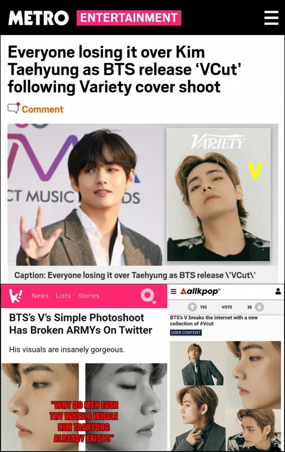 뷔가 공개한 사진은 최근 미국 매체 버라이어티(Variety)에 게재된 방탄소년단 화보 비하인드 사진으로 뷔가 '최애'라고 알려진 유명 포토그래퍼 홍장현이 촬영했다.