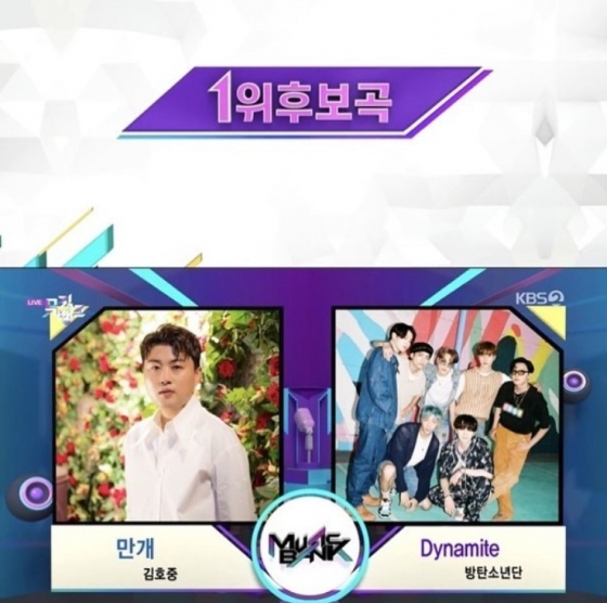 공개된 사진 속에는 캡처 사진이 올려져 있다. 김호중은 곡 '만개'로, 방탄소년단은 곡 '다이너마이트'로 1위 후보에 올랐다.