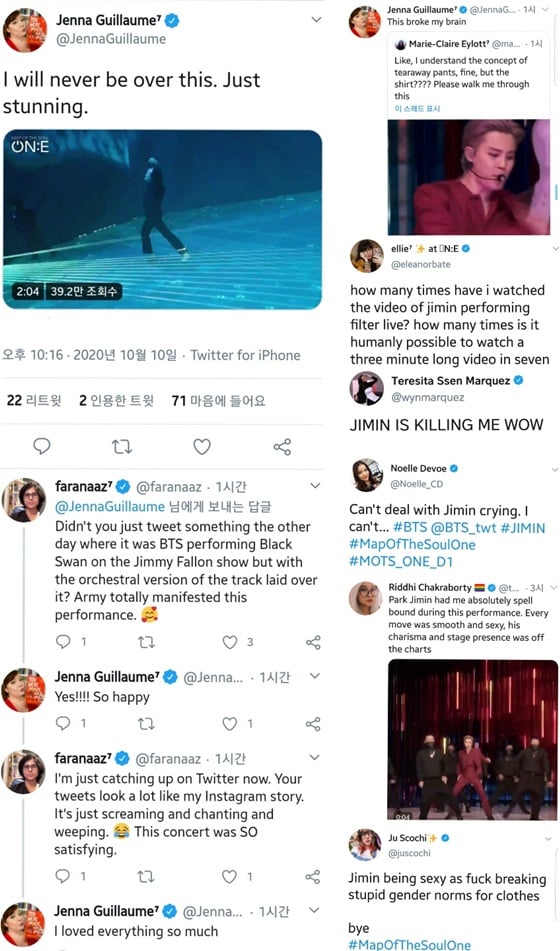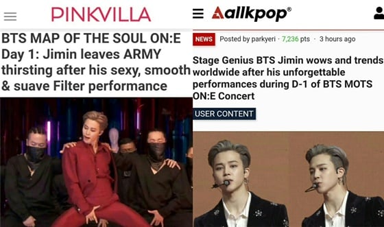 미국 K팝 전문매체 올케이팝(allkpop) 또한 11일 "'무대천재' 방탄소년단 지민이 'BTS MOTS ON:E'에서 잊지 못할 무대를 선보인 후 전 세계적으로 큰 기대와 트렌드를 보이고 있다"며 '블랙스완'의 솔로 현대무용과 빌보드 월드 디지털 송 세일즈 차트 1위의 히트곡 '필터'의 첫 무대에 대해 2차례나 집중보도했다.