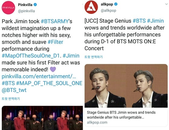 인도 매체 핑크빌라(pinkvilla)는 이날 공연 후 "방탄소년단 지민이 섹시하고 매혹적인 '필터' 퍼포먼스로 팬들을 사로 잡았다"며 발 빠르게 소식을 전했다.