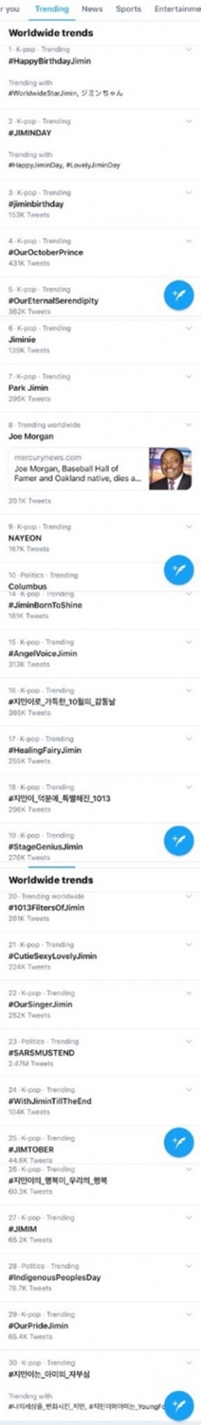 지난해 10월 13일 지민의 25세 생일에 전 세계가 동시에 폭발적으로 생일축하 해시태그를 쏟아내 월드와이드 실시간 트렌드 톱 20위 전체를 차지한 트위터(Twitter) 역사상 최초의 아티스트가 된 것.