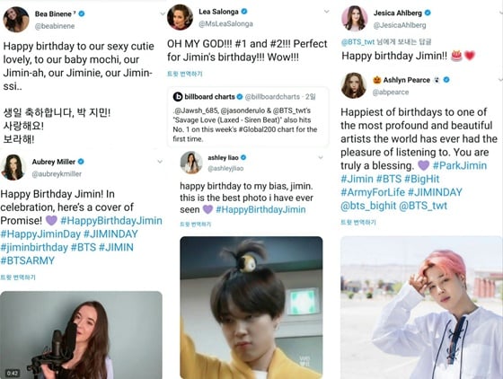 한국어로 생일 축하 메시지를 전한 필리핀 배우 베아 비넨(Bea Binene)에 이어 최근 '타이니 데스크 콘서트'(Tiny Desk Concert)를 통해 지민에게 매료됐다고 밝힌 미국 배우 애슐리 랴오(Ashley Liao)도 "나의 최애 생일 축하해"라며 '짐토버'(Jimtober, Jimin+October) 축제를 즐겼다.