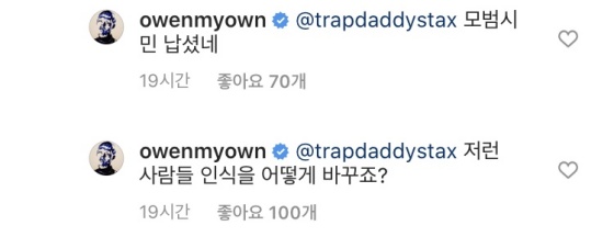 또한 오왼은 19일 자신의 인스타그램에서 대마 흡입을 지적하는 네티즌과 설전을 벌이기도 했다. 한 네티즌은 "대마 안 하고 살아가는 사람들은 머저리라 법을 지키고 사냐"는 댓글을 남겼고, 오왼은 대마초 합법화를 주장해 온 래퍼 빌스택스를 태그하며 "모범시민 납셨다"고 비꼬는 답글을 달았다. 이와 함께 빌스택스에게 "저런 사람들 인식을 어떻게 바꾸냐"고 묻기도 했다.
