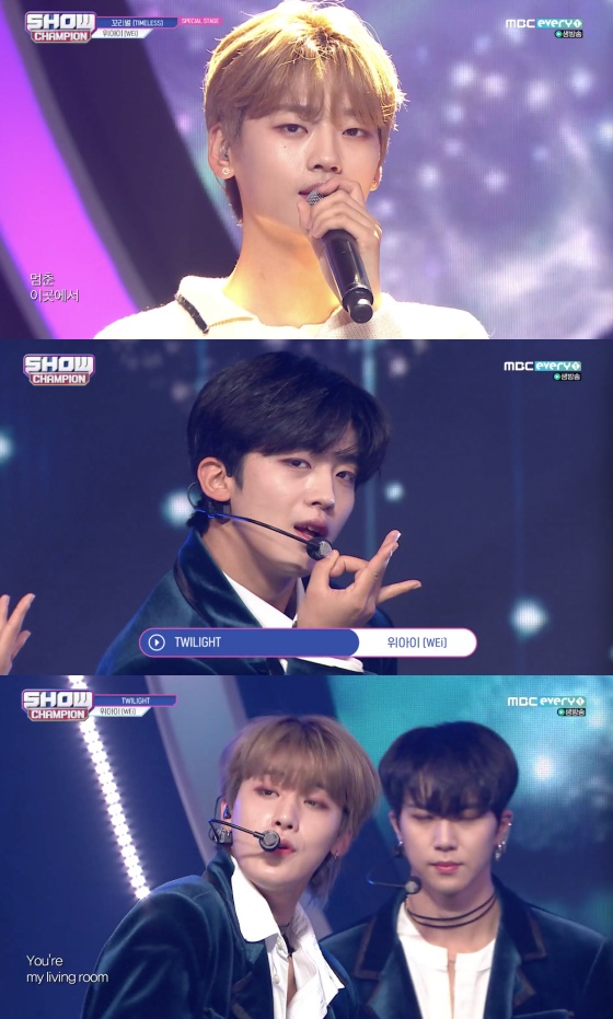 21일 오후 방송된 MBC 에브리원 '쇼! 챔피언'에는 위아이가 첫 번째 정규앨범 'IDENTITY : First Sight' 타이틀곡 '트와일라잇' 컴백 무대를 선보였다.