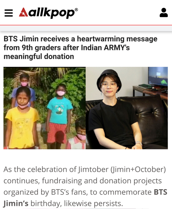 미국 연예매체 올케이팝(Allkpop)은 "방탄소년단 지민의 생일을 기념해 짐토버(Jimin+October) 축하 서포트로 모금과 기부 프로젝트가 끊이지 않고 있다"며 인도 팬의 뜻깊은 기부 후 따뜻한 화답에 대해 전했다.