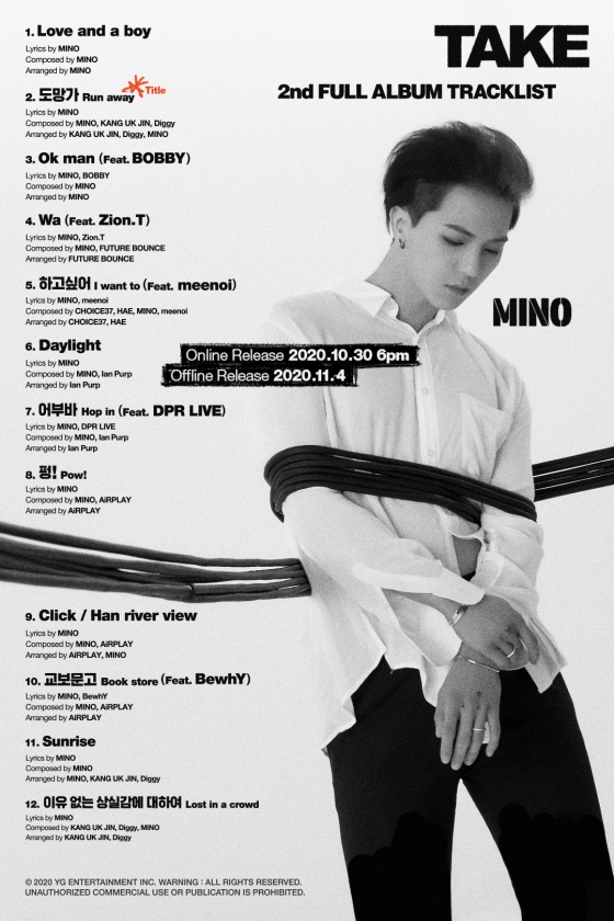 소속사 YG엔터테인먼트는 22일 공식 블로그를 통해 'TAKE' 트랙리스트 포스터를 게재했다. 끈에 묶여 있는 송민호의 흑백 이미지가 부드러우면서도 강렬한 분위기를 자아낸 가운데 타이틀 곡 '도망가'(Run away)를 포함한 12곡의 정보가 담겼다.