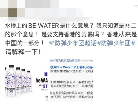 중국 네티즌들은 'be WATER'라는 슬로건을 두고 문제를 삼기 시작했다. 'Be Water'는 홍콩 시위대의 슬로건인 동시에, 시위 전략 중 하나에 속하기 때문이다. '하나의 중국' 원칙을 고수해온 중국에서는 홍콩·티베트 같은 주권 문제는 매우 예민한 이슈다.
