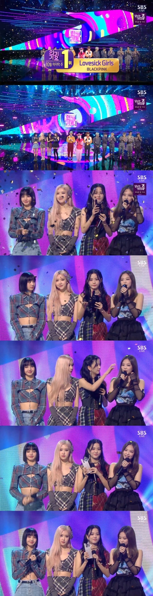 블랙핑크는 25일 방송된 SBS '인기가요'에 출연해 첫 정규앨범 타이틀곡 'Lovesick Girls' 무대를 꾸몄다. 압도적 1위 후보에 걸맞은 화려한 무대였다. 블랙핑크는 '인기가요' 10월 마지막주 트로피를 거머쥐며 이 성원에 보답했다.