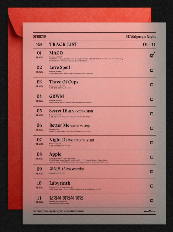 소속사 쏘스뮤직은 26일 여자친구 공식 SNS 채널을 통해 새 앨범 ''回:Walpurgis Night' 트랙리스트를 공개했다.