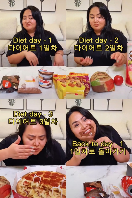 하지만 다이어트 3일 차가 되자 치킨의 냄새를 맡고 힘들어하더니, 결국 4일 차에 치킨과 초콜릿을 먹으며 다시 1일차로 돌아가는 모습이다.