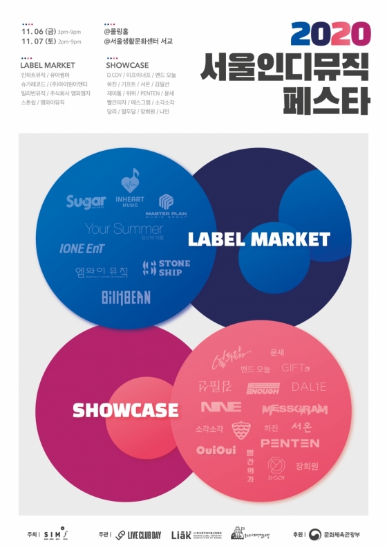 인디뮤지션과 팬들을 위한 '2020 서울인디뮤직페스타 – 레이블마켓&쇼케이스'가 6일과 7일 양일간 서울 마포구 '서울생활문화센터 서교'와 '롤링홀'에서 개최된다.