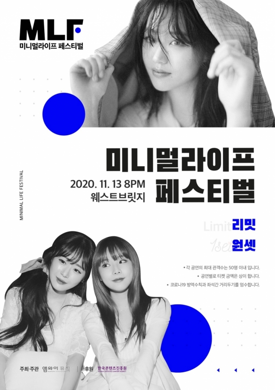 '미니멀라이프 페스티벌'의 화려한 대미를 장식할 마지막 공연이 오는 13일 오후 8시 서울 마포구 웨스트브릿지에서 열린다. 이날 공연에는 매력적인 보이스로 사랑받고 있는 여성 싱어송라이터 리밋(Limit)과 작곡·기타· 보컬을 담당하는 예진, 메인 보컬 후아유로 구성된 여성 듀오 원셋(1set)이 무대에 오른다.