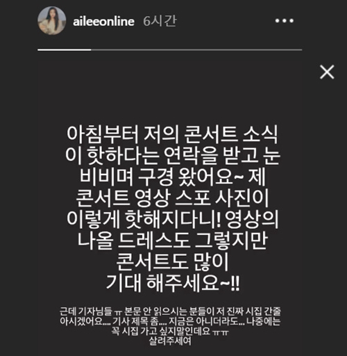 일부 팬들의 오해까지 불러 일으켰던 에일리의 깜짝 발표는 화제를 이어갔다. 이어 에일리는 13일 인스타그램 스토리를 통해 "아침부터 저의 콘서트 소식이 한사다는 연락을 받고, 눈 비비며 구경왔어요~ 제 콘서트 영상 스포 사진이 이렇게 핫해지다니! 영상에 나올 드레스도 그렇지만, 콘서트도 많이 기대해주세요~!"라고 했다.