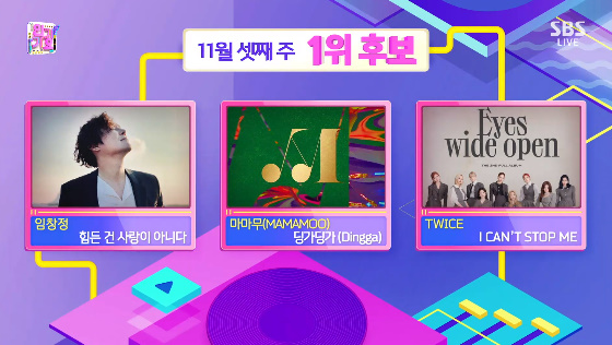 임창정은 '힘든 건 사랑이 아니다', 마마무는 '딩가딩가', 트와이스는 'I CAN'T STOP ME'로 각각 1위 후보에 올랐다.