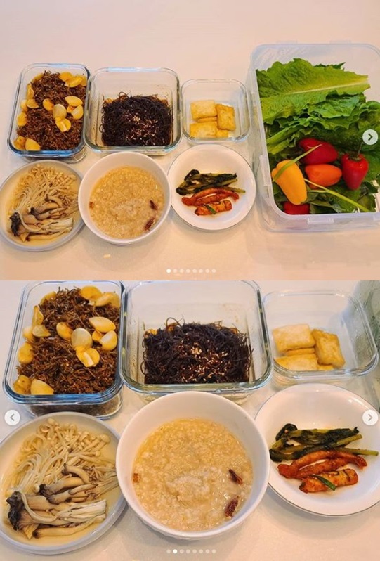 공개된 사진에는 오트밀, 버섯, 두부 무침, 더덕 무침, 멸치 마늘 볶음 등 아침상이 담겨 있다.