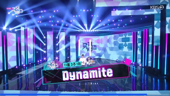방탄소년단은 20일 오후 생방송으로 진행된 KBS 2TV 음악방송 프로그램 '뮤직뱅크'에서 1위를 차지했다. 이날 컴백한 방탄소년단이지만 '다이너마이트'가 여전히 막강한 화력을 보여주면서 1위 트로피를 하나 더 추가했다.
