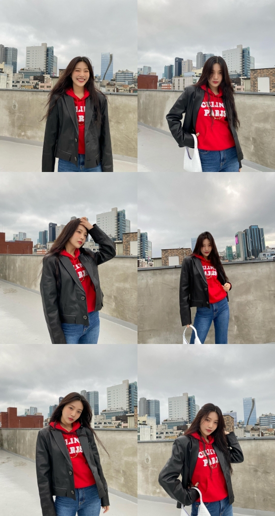 공개된 사진 속 조이는 검은색 오버핏 가죽 재킷에 빨간색 레터링 후드티를 입어 포인트를 줬다. 이어 청바지를 소화해 레트로한 분위기를 살렸다.