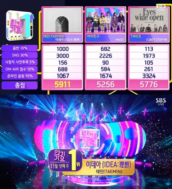 22일 방송된 SBS '인기가요'에서는 태민의 '이데아'와 여자친구의 'MAGO', 트와이스의 'I CAN'T STOP ME'가 1위 후보에 오른 가운데, 태민이 1위의 주인공이 됐다.