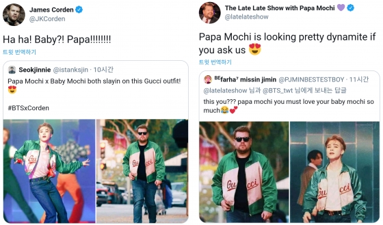 '파파모찌'(papa mochi)라는 별명 덕에 ‘지민의 미국 아빠’로 불리는 코든은 팬들이 지민과 같은 옷을 입은 사진을 나란히 올리자 자신의 트위터 계정에 이를 인용해 "파파모찌가 꽤 다이너마이트(뮤직비디오)같다"고 너스레를 떨며 유쾌한 반응을 보였다.