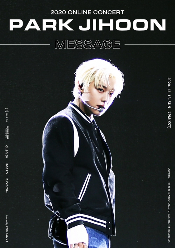박지훈의 온라인 공연 '2020 PARK JIHOON ONLINE CONCERT [MESSAGE]'는 12월 13일 오후 7시 전 세계에 생중계된다. 관람을 원하는 국내 팬들은 KT 올레 tv와 Seezn(시즌)에서, 해외 팬들은 KAVECON(케이브콘) 플랫폼에서 공연 VOD와 생중계 공연을 함께 만나볼 수 있다.