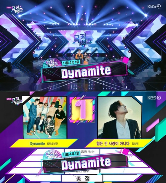 27일 오후 방송된 KBS 2TV '뮤직뱅크'에서는 방탄소년단의 '다이너마이트'와 임창정의 '힘든 건 사랑이 아니다'가 11월 넷째 주 1위 후보에 오른 가운데, 방탄소년단이 출연 없이 1위를 차지했다.