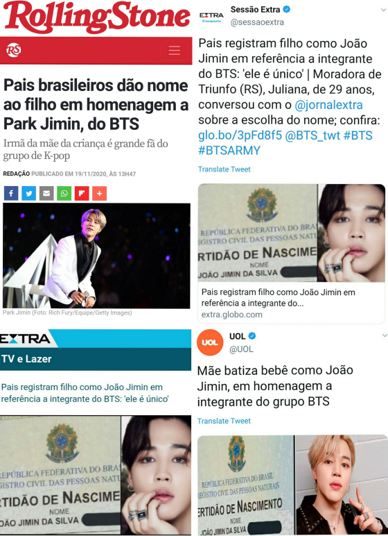 최근 SNS 상에는 지난 10월 22일 브라질에서 태어난 아이의 것으로 보이는 출생 증명서가 공개됐다. 출생 증명서 상 등록된 아이의 이름이 방탄소년단 지민의 이름을 딴 '주앙 지민'(João Jimin)으로, 이는 현지 매체들의 취재 열기로 이어졌다.